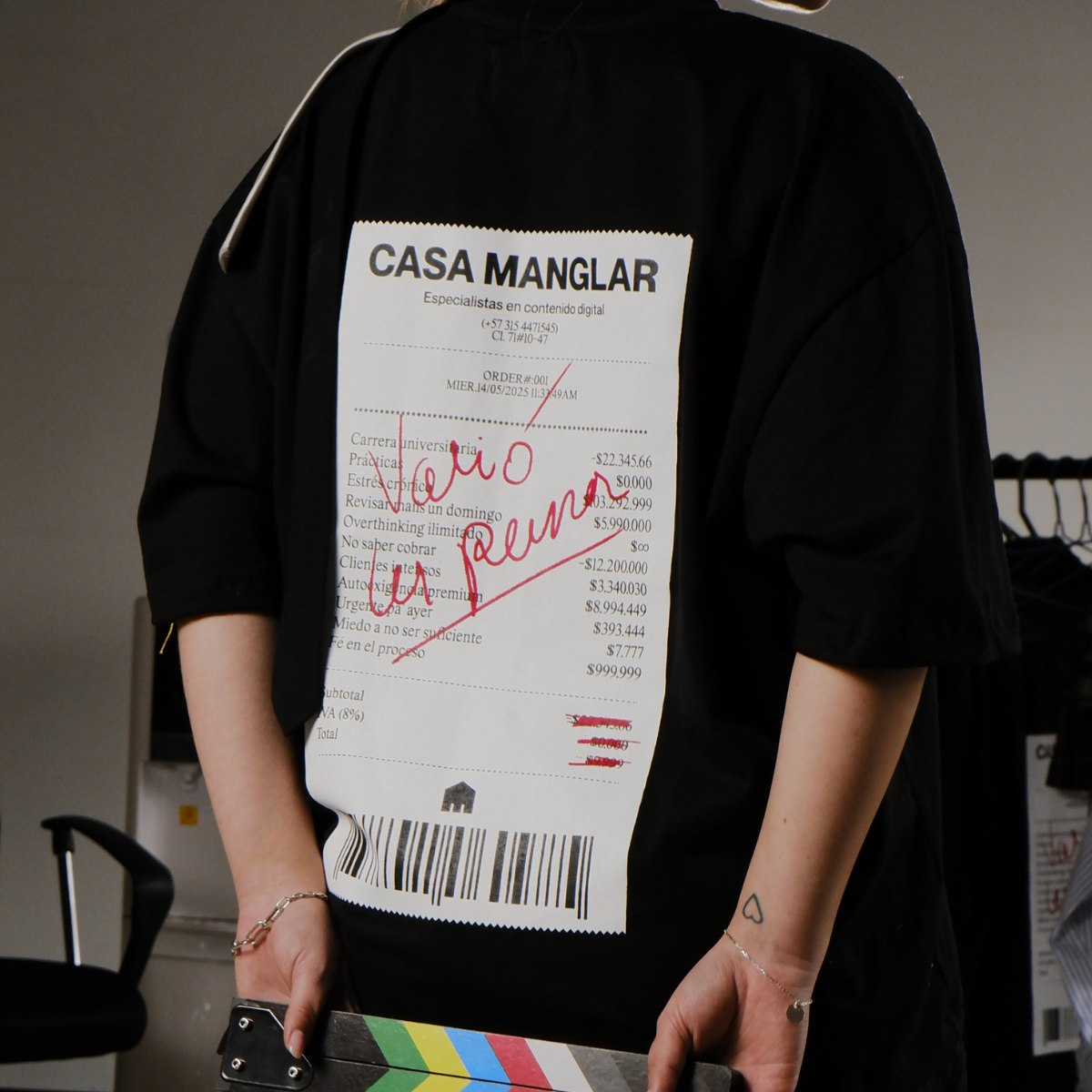 Estampado trasero: Gráfica tipo factura con todo lo que se invierte para que una toma lo diga todo.